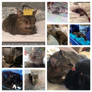 Marley was our sweet and spicy girl for the past almost four years. She came to us neglected and emaciated. It was estimated that she was likely 12 years old at the time but was likely a few years older than that. Marley loved her stuffed giraffe, car rides, Chick-fil-A grilled nuggets, kitten milk, cozy blankets, flowers, sunbeams, and cuddles on her terms. She was definitely the queen and boss over her feline brothers but loved them and us fiercely. Marley Girl, our Mar-Mar, we will miss you and are so grateful we were able to love, spoil, and take care of you for the last four years.