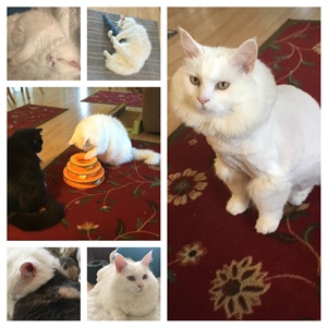 Both cats were feral. Romeo (Kitten) came to us for help after a fox had tore him up, so we took him in and bandaged his hind leg. He never went out again and remained terrified of fox sounds in the night for the remainder of his life. Faith (Peanut) was found behind some dumpsters with a damaged eye. We don't know what had happened to her, but she was blind in that eye after that. Even thought her eye kept getting more swollen and bigger as time went on, she never let it deter her from living her best life. Both cats had the spirits of kittens, but their bodies failed them.